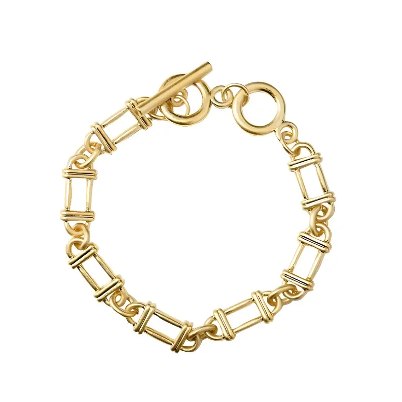 A modern paperclip link chain bracelet in gold, crafted from zinc alloy metal with exceptional rhodium plating for lasting shine. Designed with a toggle clasp and two rings, it can be worn at 19 cm or 21 cm for a comfortable adjustable fit. Hypoallergenic and compliant with nickel, lead, and cadmium regulations, it offers both style and safe everyday wear. Comes with a box, making it perfect for gifting.
