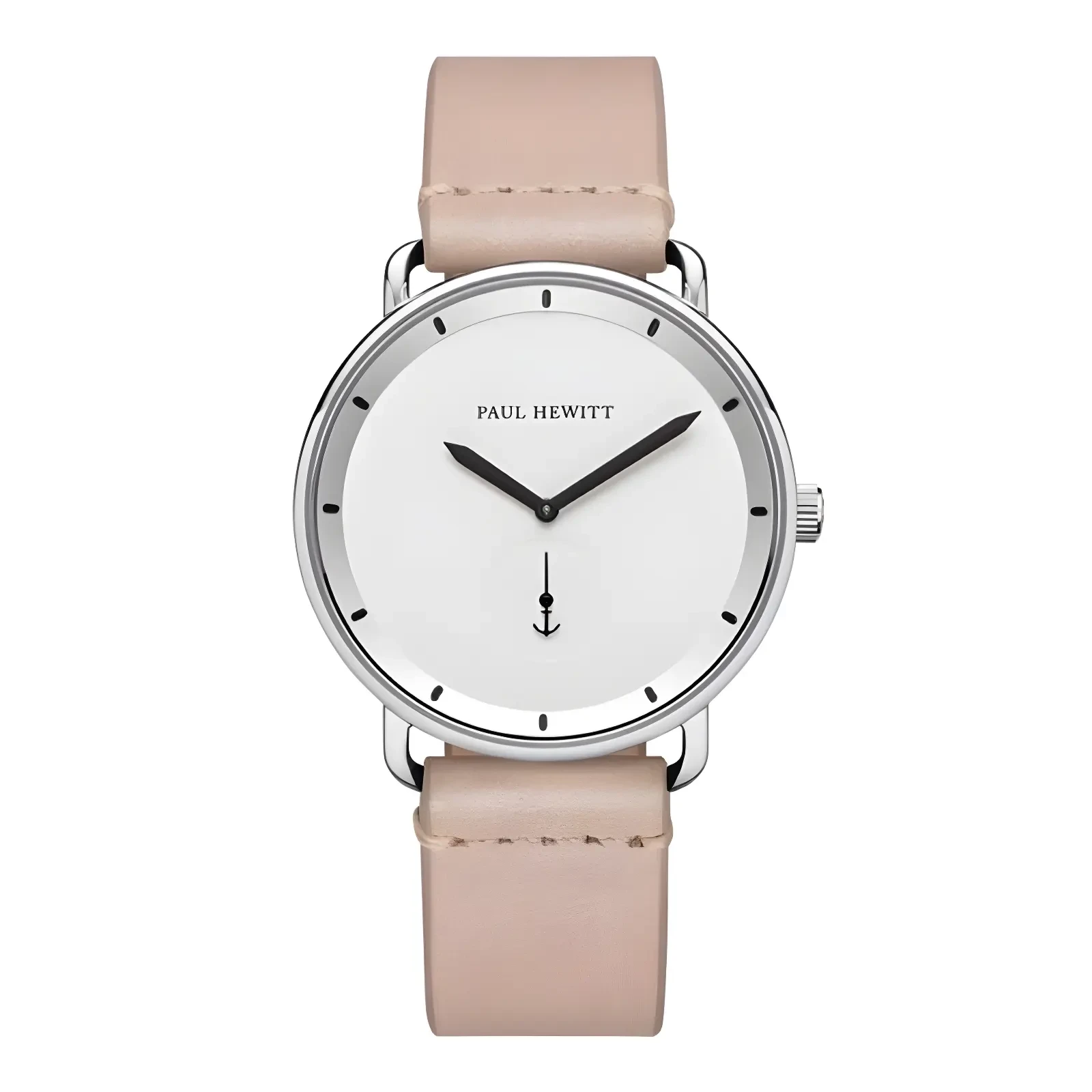 The PAUL HEWITT Breakwater White Dial Watch (PH-BW-S-W-56M) offers a clean, classic look that fits seamlessly into your everyday style. Its crisp white dial and 42mm silver stainless steel case exude quiet confidence, while the soft beige leather strap adds a touch of warmth and elegance. Whether you’re heading to work, meeting friends, or enjoying a relaxed weekend, this watch is an easy choice that always looks right.