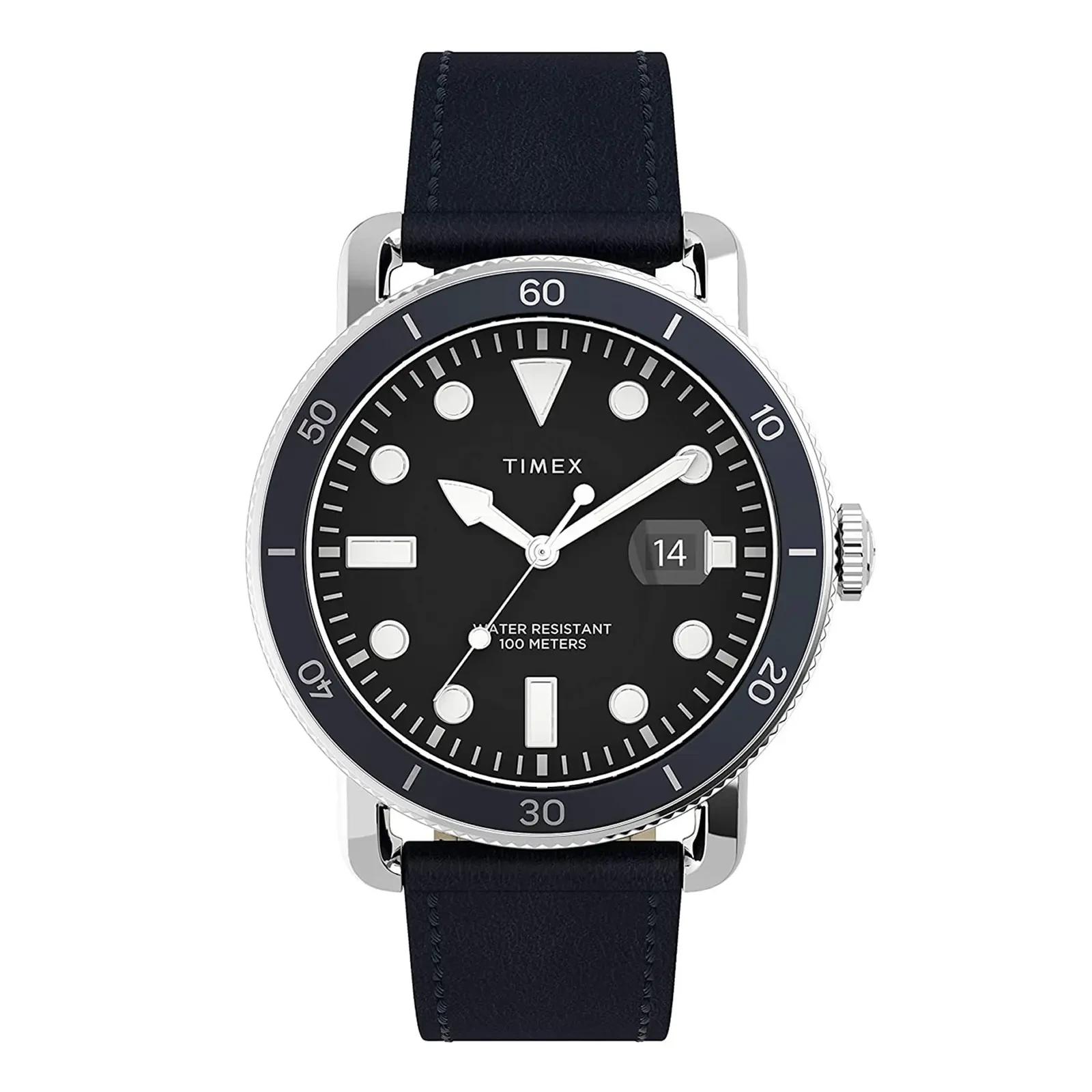 A Timberland watch featuring a black textured dial with tree design, silver-tone case, and a tan leather strap.