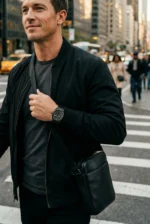 Stilingas juodos spalvos Jason Hyde laikrodis su tinkline apyranke, juodu ciferblatu ir sidabriniais akcentais, su užrašais „SEVENTIES“ ir „WATER RESISTANT“.