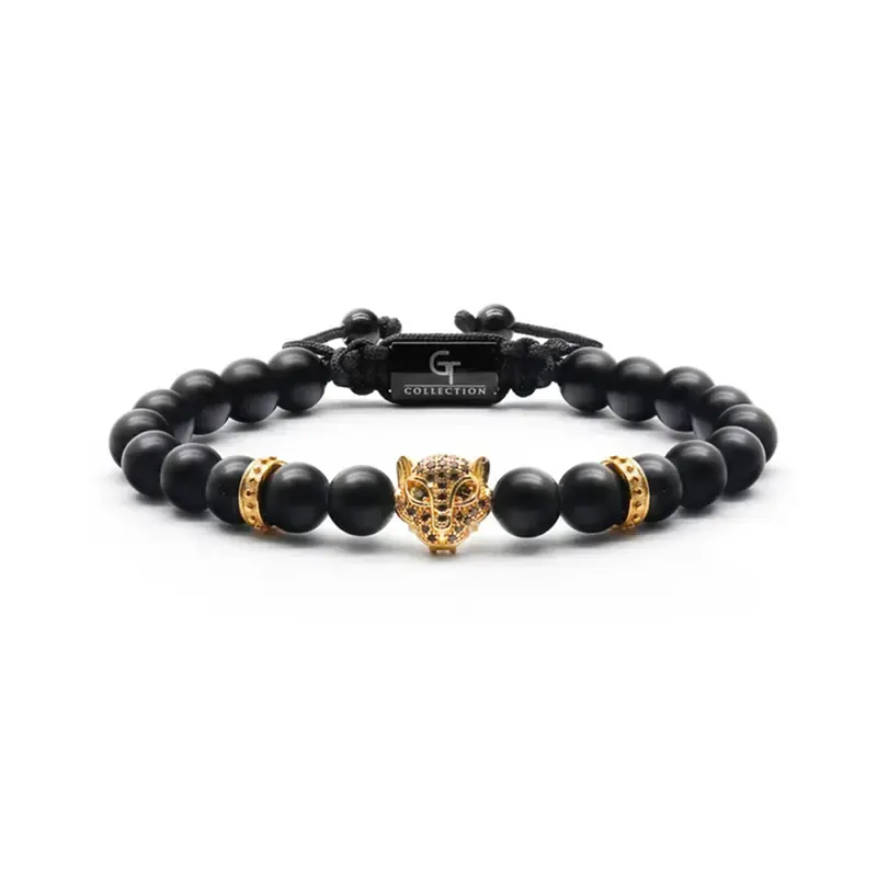 GT-COLLECTION Black Onyx Bracelet With Golden Leopard Head