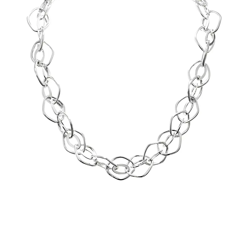 A modern double link chain necklace in silver, crafted from zinc alloy with a sleek rhodium-plated finish. Measuring 49 cm with an adjustable option at 47 cm, it fastens with a toggle clasp featuring two rings for versatile sizing. Stylish and comfortable to wear, it’s a bold yet refined accessory for everyday outfits. Delivered with a box, making it a great gift choice.