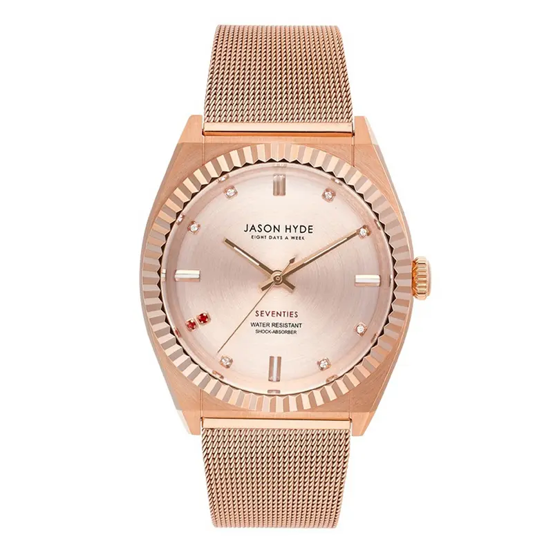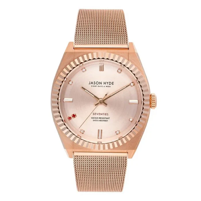 An elegant women’s watch in rose gold from the Ruby Eight collection, designed with a clean minimalist aesthetic. Perfect for both office and everyday wear, it blends refined elegance with the modern watchmaking approach of Jason Hyde.