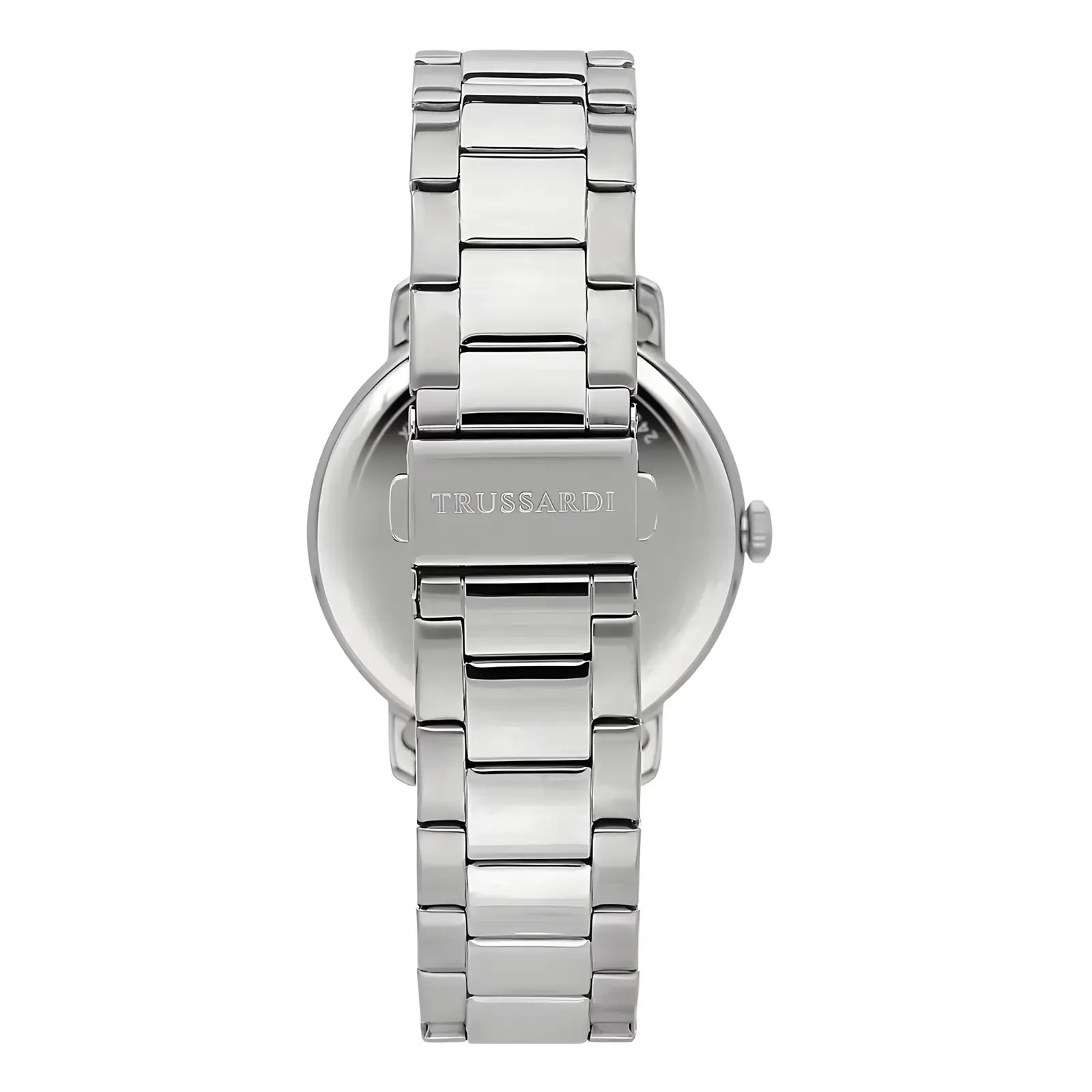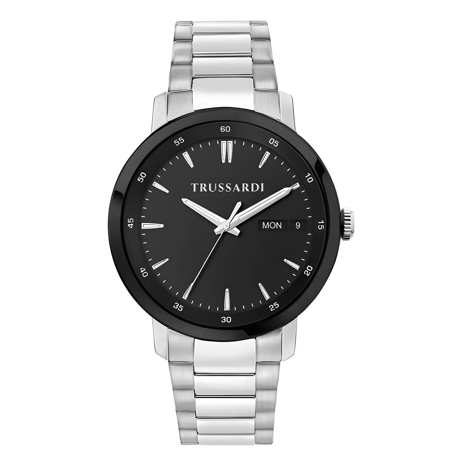 Trussardi meeste käekell. 41 mm musta roostevabast terasest korpuse ja klassikalise hõbedase rihmaga kvartskell tagab täpsuse ja vastupidavuse. Veekindel kuni 5ATM, sobib ideaalselt igapäevasteks seiklusteks. Ajatu aksessuaar igale kaasaegsele mehele.