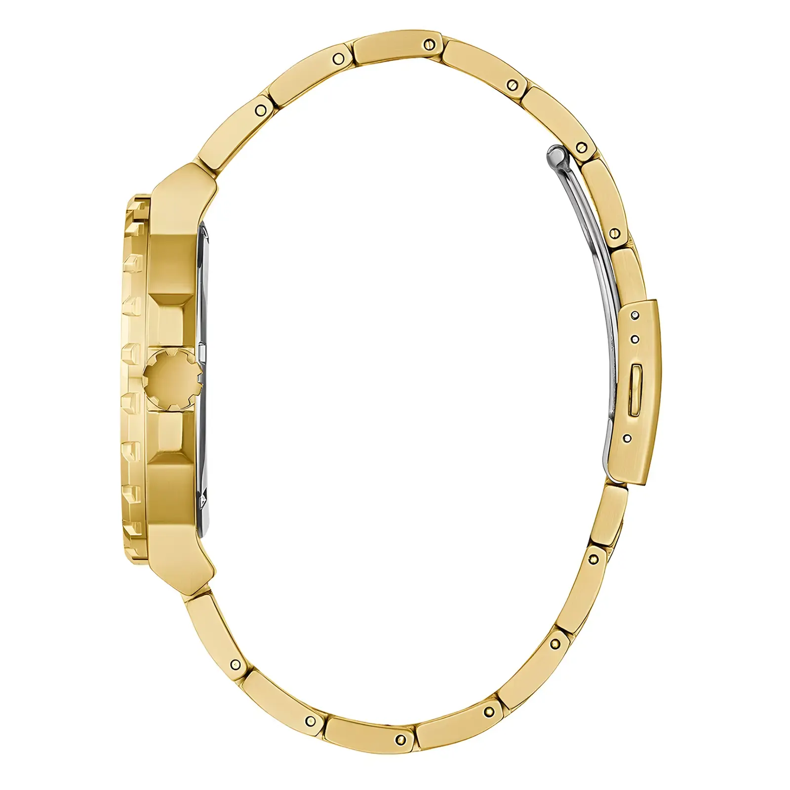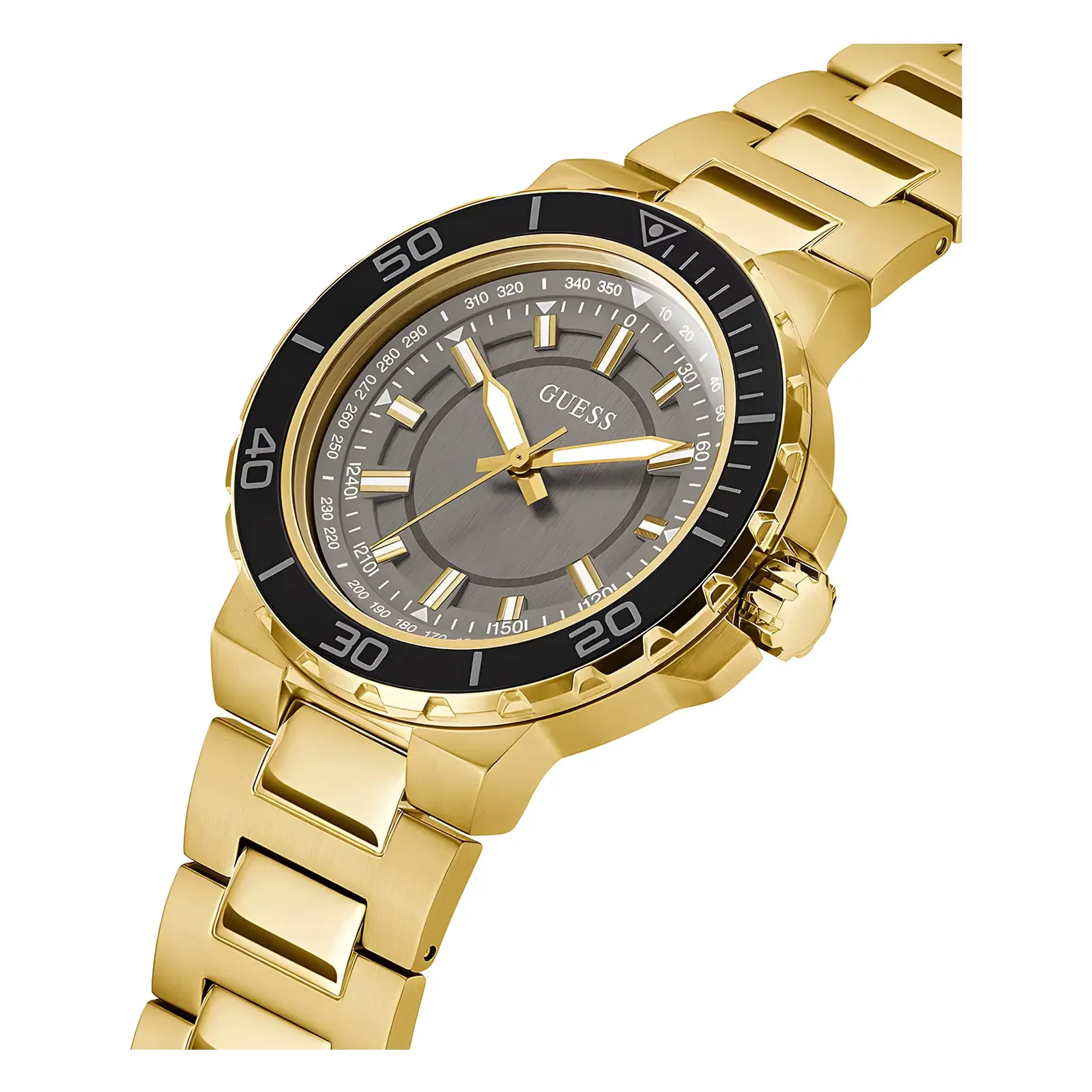 Guess GW0426G2 -kello, suunniteltu modernille miehelle. Sen näyttävä kultainen ruostumattomasta teräksestä valmistettu kotelo ja ranneke kiinnittävät huomion, kun taas musta aksentti lisää hienostuneisuutta. Luotettava kvartsikoneisto takaa tarkkuuden, ja 5ATM vedenkestävyys tarjoaa mielenrauhaa päivittäiseen käyttöön.